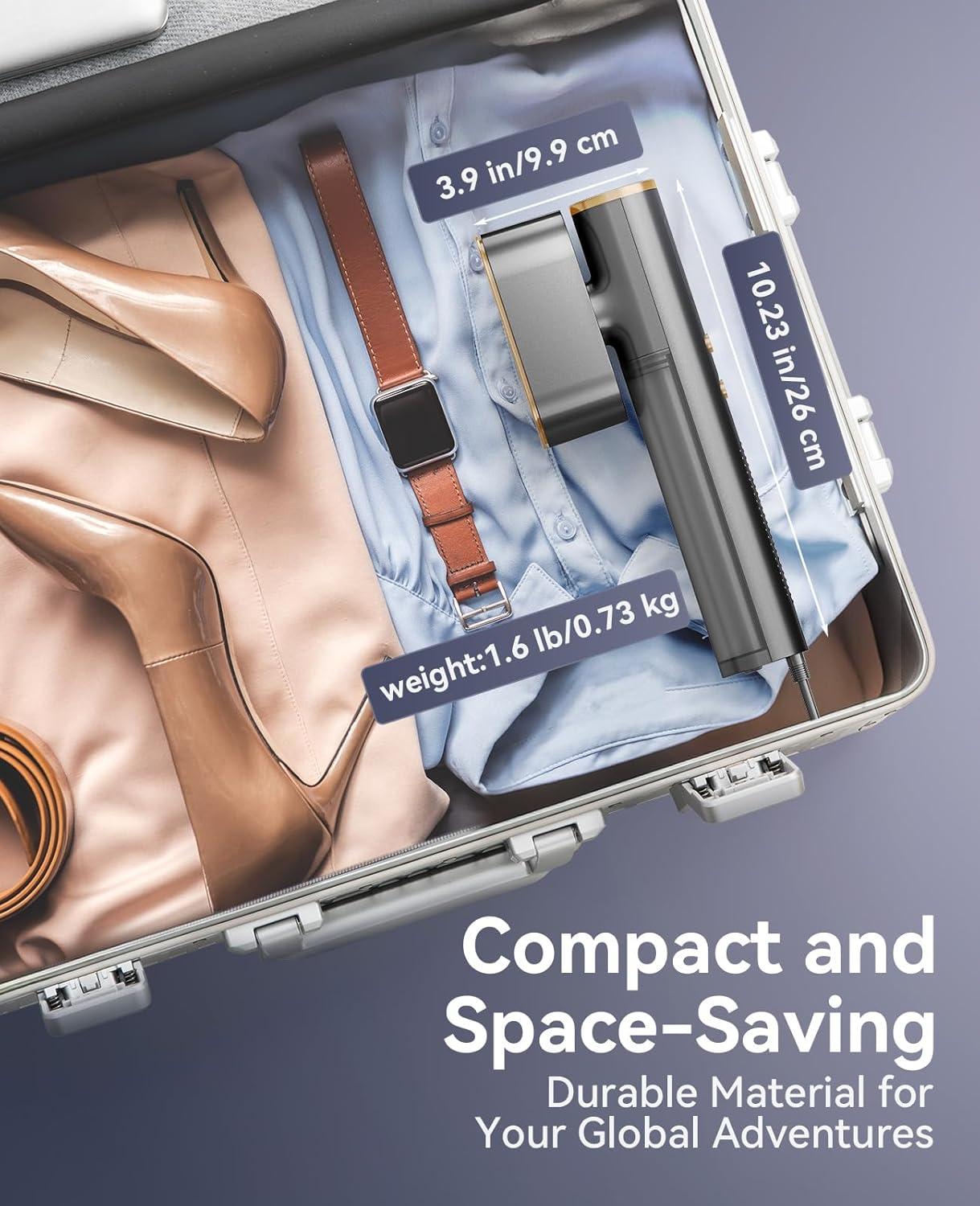 TRAVEL PORTABLE HANDHELD SIZE STEAMER: Jack & Rose portable travel mini clothing steamer is compact and easy to hold, measuring 10.23×3.9 inches, 1.6 Ib is consistent with a 750ml bottle of mineral water. But the wrinkle removing function is not comparable to the full size steamer, rotating steam head maximizes space and easy to fit into backpack travel case. Deluxe travel bag for easy packing.7.2ft cord and high temperature heat-resistant plate are easy to use.